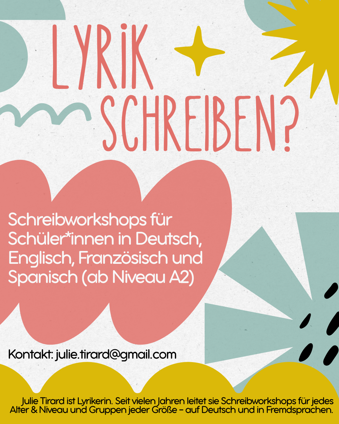 For writing or translating workshop requests (in French, German, English, Spanish) with adult, university, or school groups in France, Germany, Switzerland, Chile, Argentinia, please contact: julie.tirard [at] gmail [dot] com